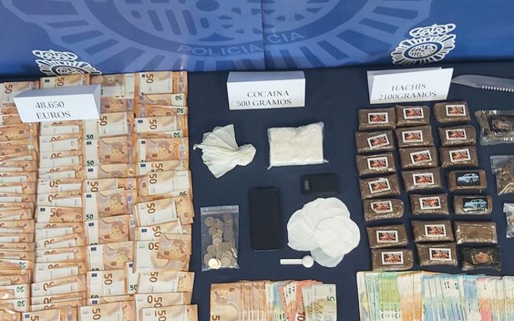 A primera hora de la tarde se inició el registro, con la incautación de 470 gramos de cocaína y 2.150 gramos de hachís. Además, le han sido intervenidos 49.440 euros en efectivo, “cantidad que se presume tiene su origen en el tráfico de drogas”.