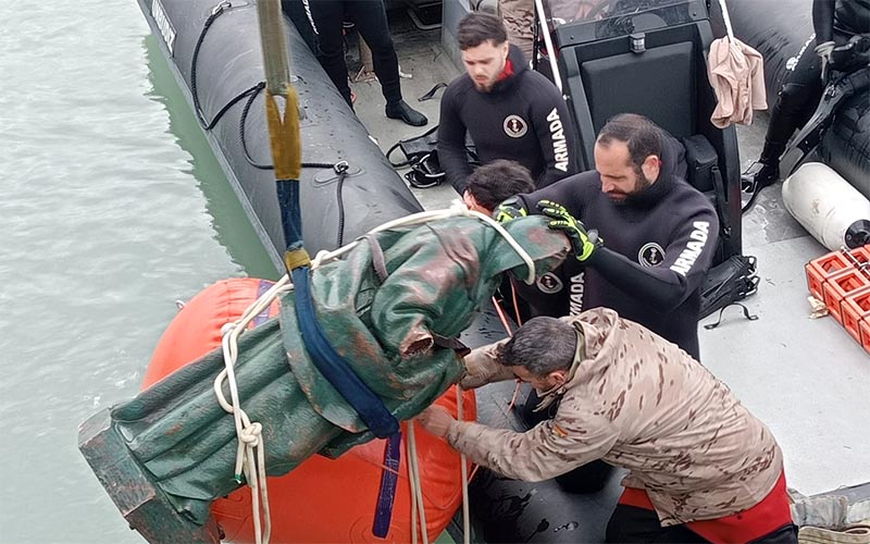 Ha sido hallada por los militares en un primer momento con un dron y, una vez ubicada, un equipo de diez miembros de la Unidad de Buceo de Cádiz de la Armada, con base en la Estación Naval de Puntales (ocho buceadores en configuración de superficie y dos tripulantes) han participado en su recuperación, se relata en la nota remitida a DIARIO Bahía de Cádiz.