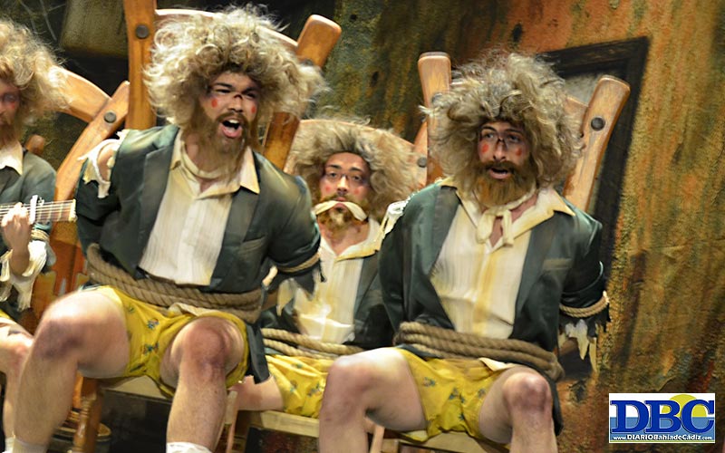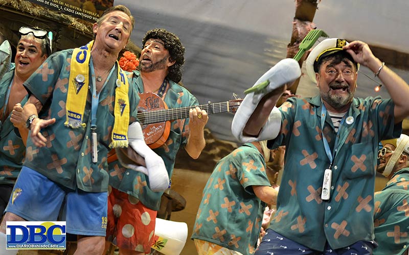 Sube, sube la temperatura con el Sheriff en escena. ¡A ver si termina el árbol genealógico! Jajaja. Puntazo ahí, entre lo oscuro del patiobutaca. “Lo mal que estoy, y lo poco que me quejo… yo no soy flojo, es que la tengo de cemento… pero no echarme fotos, que estoy de baja”. Saluda la chirigota ‘Los semicuraos’, con letra y música de Juan Manuel Braza Benítez. Medio-escayolaos, en el chiringuito. Defensa del estilo propio, sin bajarse los pantalones a los gustos del jurao de turno, en ese pasodoble llorón con shentimiento de Loreto: “mis dolores se curan cantando… me duele los que por ti mueren y luego se olvidan… yo loco por mi Tacita, y tú estás loco, loquito de envidia”. “Con los sueldos que han ganao, cuántas juergas y putas habrán pagao…”, se pregunta la segunda letrilla facilona, observando a todos los políticos como inútiles mangantes, a los que no persigue la mutua. Todos son iguales, Juan. Aro. Tanda de cuplés, de dos en dos. Tiritos a los comparsistas para acabar rescatando al Carli y al Subiela; y otros fantasmagóricos. O argo. “Si en estos carnavales, tú a mí no me ves, búscame, búscame, porque yo no me encuentro bien”. El popu, frenético, fiestero y perseguido por el detective de la mutua (palabro que se repite insistentemente), es lo que es, sin más, hasta un remate potable: “ni de baja ni de bajón, no quiero verte Tacita… que en la vida siempre hay altas y bajas, lo importante es no perder la ilusión… sal del agujero y toca el cielo”. Toca, pero no sobes, Juan.