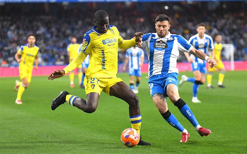 Con más presencia amarilla en campo gallego se fue desarrollando el primer tiempo, mostrándose el Cádiz como equipo serio y con cierta hambre ante un Deportivo agarrotado ante la presión visitante. La primera media ocasión la protagonizaba Chris en el 5, recogiendo un gran pase de Ontiveros; más adelante, a punto estaba Sobrino de llegar a un centro de De la Rosa; y ya en el minuto 27, Moussa Diakité la colocaba a la escuadra en un trallazo desde la frontal pero se encontraba al acertado Helton.