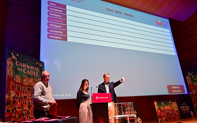 Un Concurso Oficial de Agrupaciones Carnavalescas de Cádiz (el COAC 2026), con 180 agrupaciones en total (cae el total de los mayores, 124, y crece el de la cantera, hasta las 56), que en esa misma primera sesión del domingo 11 de enero, cinco días después de apagarse navidades, también estrenará las coplas de grupos esperados, como la comparsa del Chapa y Raúl Cabrera y las chirigotas del Sheriff y de los Pibes.