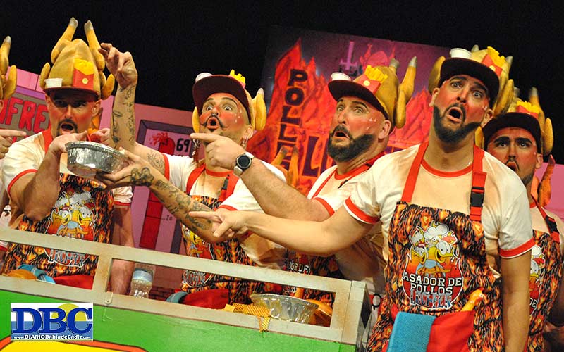 “Lucifer hace los mejores pollos desde Algeciras a Vejer”, jejeje. En una infernal pollería se presenta ‘No le doy más vueltas que me caliento’, chirigota algecireña con José Rafael Castro, Agustín Carlos González y Álvaro Castro, en la autoría: “si no tienes ganas de hacerte de comer, vente, vente, vente”. Pasodoble con su formato jijijaja antes de ponerse intensito. Buscando empleado en el primero, contratan a una persona con discapacidad y “hasta puede que me lleve para el resto de mis días la mejor de las experiencias”. “Traductores aquí sobran, lo que falta es menos vergüenza y las ganas para entenderse”, opina el segundo, contradictorio y rancio, defendiendo que cada uno hable y se exprese en su lengua o dialecto, pero se ve que en el Congreso, no. Juan, ¡¡han dicho “vascuences”!! Un cuplé de “mierda”. Escatología rebañada en nocilla. Y retardando la eyaculación precoz en el otro de la tandita. Apunta el truco, Juan. “Me voy a jartá, me voy a jará, de pelá patatas y freí pimientos”. El pollo es saludable, “hola”. Sí, asín entra el simpático popu con sus peripecias de asador. En su salsa.
