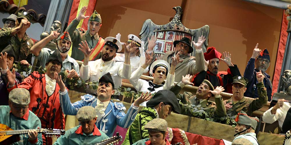 Las 20.08 horas. Arriba telón. Arriba EspÁña. Una carnicería para celebrar el fin de otra carnicería, el de la Guerra inCivil a partir del golpe militar franquista. “La raíz de este país, con sangre y con sudor se regó… España, país de carahotes que nunca aprende, sale a la arena en su eterna historia, y da la vuelta al ruedo como una noria, y gira y gira y vuelve a empezar… y ahora en estos tiempos nuevos que nos han tocado, parece que volvemos de repente al pasado, fascistas y banderas con el odio atragantado… que sin tener memoria no se tiene futuro… levántate y despierta que nos quieren torear… mi coro que es tu coro salta al ruedo un año más, con el puño cerrado pa decir no pasarán”. Saluda en modo plaza de toros allá por 1940 el coro Libertario del Chapa, Miguel Ángel García Argüez (ahí arriba de figurante), ‘La carnicería’. Metatango de primer toro, con resignación y reivindicación: “soy el tango del coro y vengo a decirles cómo me siento… en el concurso, el despreciado, en el Falla soy cenicienta y no me echan cuenta ni mis paisanos… tengo una historia, un pasado, una memoria… cansado de que me tengan arrinconado… sólo pido el respeto que me he ganao”. Y corneando sin medida ese segundo tangazo mirando al imperialismo yanki ahora con el Trump desaforao…, “tirano, el que USA a su antojo la democracia… y usaré dos palabras que se usan juntas, me da igual que me las disputas, USA país inhumano, con un gobierno tirano, que tiene de presidente a un verdadero hijodeputa”. Clarinete. A los cuplés, ¡¡iiiiiiim, olé!! ¿Patrullas ciudadanas contra la delincuencia en Cádi?, hacen más falta las patrullas con fregona. Y trasladando el Stranger Things al Falla, el Falla paralelo… “y nosotros somos fachas, y los de Julio Pardo sindicalistas”, jajaja. “El que no diga ole por qué se ha molestado, ole, ole, y ole, que le corten la oreja y el rabo”. Los ocho minutos de popurrí, son ocho minutos de vitaminas para cuerpo y mente…, “el paseíllo de los siglos se hace largo para un país con una historia resabía, la historia no ha cambiado tanto en realidad… España, vergüenza, a dónde vas… Cuánto tonto intolerante con una y otra bandera… Tan frágil es la libertad, que ahora está y ya no está, sin libertad no hay dignidad ni hay contrario, siempre estará en mis labios, en tus labios… Si yo creyera en los partidos que abusan de esta democracia, si yo creyera en las noticias, en la justicia… pero no creo… si yo creyera, solo sería en un barrio sin fronteras, en una casa sin himno ni bandera… solo sería en tus manos compañera, en el gobierno de tus besos, y en el calor que se dan nuestras caderas, tú eres mi única patria verdadera… Vente con la resistencia, vente conmigo a mi coro, despierta amigo despierta, que estamos de fiesta, que te pilla el toro…”. Como manda el rito tras una buena corrida, sacada de pañuelos, ya lo interpretas como veas. Aunque lo que se saca el Chapa con esta bar-ba-ri-dad es otra cosa. Pero al Javi Bohórquez no le colocas este tipo, cabesaaaa. Porque un coro no solo es tradición, emoción, algo bonito, un bailoteo…, un coro también es combate, compromiso y memoria. ¡A las barricadas, Juan!