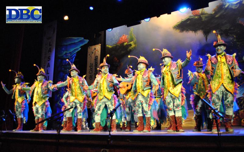 Baaajo el maaaaar… “díganme si no es bonito despertar en el fondo del mar”. Allí sobreviven estos seres-monstruos marinos con escamas, cresta, chalequillo y gorro, “como si fuera carnavaaaal”. Desde Ronda bucea la comparsa ‘El arrecife’. Glup glup glup. Manuel Barragán Gallardo es el autor de la letra, y Horacio Calvillo Melgar, de la música. Inmigración, pateras y barquillas encallan en el primer pasodoble. Y lamentando que por quienes abusan y matan, justos paguen por pecadores, y las mujeres te tengan miedo “tan sólo por ser un hombre”. Homenaje inmerecido a Bobesponja en la entrada a los cupletillos, enguashisnaos: solucionando el poblema de la alopecia, “y ahora la cabeza le huele igual que los calzoncillos”. Para el saco de los cuplés de peña que va a Turquía a ponerse pelos de abajo arriba. Afú mumá. Y si dicen que los peces siempre mueren por la boca, serán por la boca tuya, que a la mía vuelve loca. Efectista y musical ese pupurrí en el que las formas inundan el fondo, fondo de esta revolusión acuática que no se sabe muy bien qué y por qué. El fiscal se ahoga en un vaso de agua.