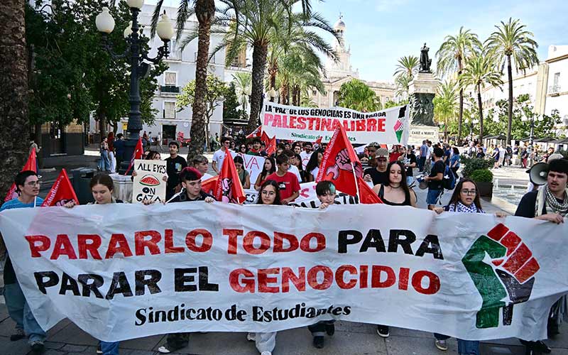 Un rato después, también desde la plaza de San Juan de Dios de Cádiz, el Sindicato de Estudiantes, reuniendo a alumnos y profesores, iniciaba una marcha hasta la Subdelegación del Gobierno para dejar claro que “la lucha sigue hasta que Palestina sea libre”, y acababa con asamblea en la plaza Asdrúbal.