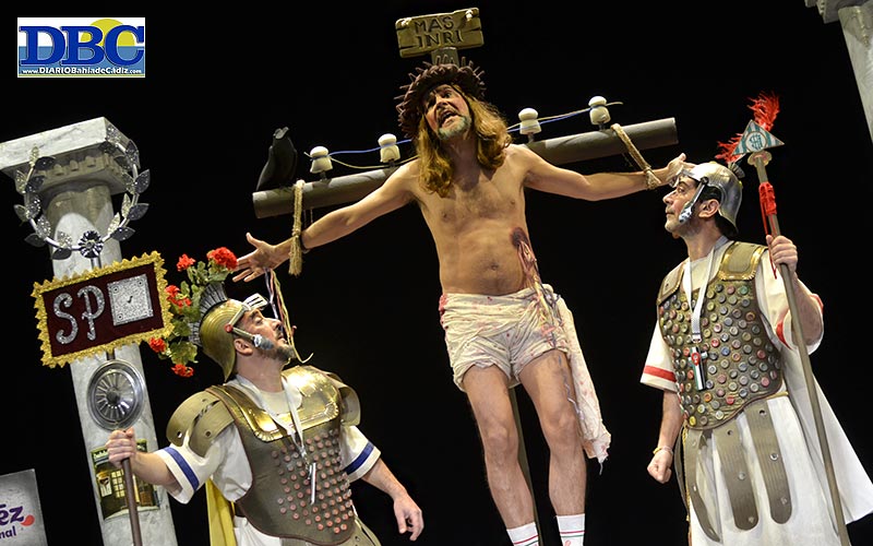 Y tocó la crucifixión, rimaíta. Nuevo capítulo de ‘Crónica de una muerte más que anunciada’, el cuarteto evangelista sin-nombres…, “y si voy a morir, prefiero un infartito miocardio… desde que estás en la cruz, estás tú mu subidito…”. Con su ratito de charla con dios, en este pase interpretado por la Mirian del OndaCádi…, “a todo carnavalero le llega su Antonio Martín”, jejeje. Y la aparición de la madre, la María…, “el sistema patriarcal tiene… los siglos contados… me duele más a mí, que a ti… Jesús, la magdalena buena es la migaíta en café… picha, lo habéis clavado… ¡¡toca las palmas, Jesús!!”. Curiosa la parodia, conectando ya fácil con el Falla, que se conoce el potaje. A los cuplés: recomendando el soterramiento de la carrera oficial, asín “la procesión va por dentro”; y la virgen de la Palma y la Macarena retocada de palique. Bueeeno. La pechá de tontos que uno tiene que aguantar, en semana santa y en el carnavá, niña. Ya en el tema libre se cuela el palomo…, “y mientras José estaba trabajando, las tardes a mí se me pasaban volando… y aún hay gente que después de dos mil años, se sigue tragando que este fue obra del espíritu santo…”. Y se acerca el sacabó: “¿hijo mío, vas a palmar…?, no creo que me dé tiempo ir a Conil… y muero, porque no muero… sois mu pesaditos, con que en Gades hay que morir… ¿Llamo a Salud Responde?, cuando responda ese hombre, está jarto de resucitar”, jejeje. “Todo era broma, menos lo último que he dicho”. Lo del PP, Juan, lo del PP. Curradísima esta pasión carnavalera, blam blam. Labajo rima con dercaraho. Esa boca, niñooo.