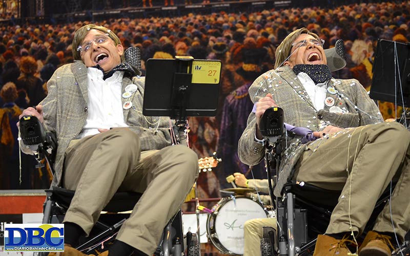 Y aporreando por última vez esta semifinal, ha llegado el máquina, ha llegado el máquina: Hawking disfrutando, sobre ruedas, del carnavá de Cádi…, “si tienes ganas de llorar, piensa en mí”. ‘Una chirigota en teoría’ ya hace tipo tipo ensillado sobre las tablas. Pito pito, pi pi. Un primer pasodoble para justificar y encomiar esa voz robótica, la que te da esos tesquieros “que mi boca no podía”, y ya que el Pisuerga pasa por Valladolid, para reclamar al Gobierno “que invierta en tecnología, y en salud pa salvar vidas, mucho más que en armamento”. Pum. Instalando software del Javi Bohórquez… bueno, mejor del Transformer, jejej. “Me duele ver que tú puedas levantarte, y que tú sigas sentao”, se indigna el otro pasodoble por la pasividad de la humanidad ante tantos desmanes e injusticias. Y Palestina, Libre. Cuplés, dos: en uno le responden al Bizcocho, “no voy porque me he enterao, que el que fue a Sevilla, perdió su silla”; y en el otro se hacen eco de esas noticias en medio mundo hablando de la chirigota…, “verá tú como al final vamos a hacer famoso al Stephen Hawking”, jajaja. Me tiro al tatami. Este año, evidentemente, no vamos a caer de pie. Me-ca-go-te-la. Aunque sea en una silla, siempre en pie y de frente en un pupurrí chirigotero al tipo, y es ahí que sigue a flote en la tercera escucha…, “armémonos de valor, hasta los dientes, y deja que Cádiz te guíe hasta la alegría, escúchala y aprende… y vive la vida, que vivir es cosa de valientes”. Los agujeros negros son más bien café-con-leche y emiten radiación debido a efectos cuánticos, y esta chiri crea adicción. Juan, ¡¡teórizame!!, con sacarina.