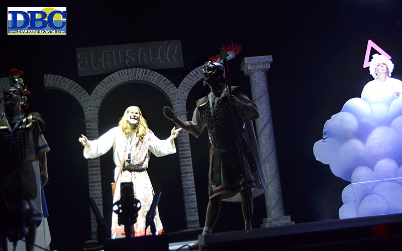 Momento cuarteto sorpresa. Sin autorizarse los datos de la autoría de ‘Crónica de una muerte más que anunciada’. Ojo. Parad las rotativas. ¡¡Un cuarteto rimado!!! Están locos estos romanos. Nos vamos a Jerusalén, con un par de centuriones de guardia. Y ahí aparece Jesús, sin frenillo, a borriquín… “hijo de María y José… lo de José es por poner algo… ¿tú cuántos les echas al chavá?, no llega a los treinta y cuatro”. Con la Koki surgiendo en los momentos más místicos de la parodia, como dios entre las nubes. Parodiando la vida y obra de este personaje histórico, mientras el Falla se mantiene expectante. ¿Son buenos o lo disimulan? “Cádiz no vale ná comparao con Gades… no había tantas tonterías, porque por suerte no había nacío Bruno García”. De primer cuplé. Mucho mejor el segundo, buscando un nuevo presidente de paja para Venezuela, sin gracia, sin carisma… y ahí ven a “Bruno García”, jajaja. “Hay cosas que son igual, en la Semana Santa y en el carnaval, la peshá de tontos que uno tiene que aguantar”. Sigue el asunto bíblico-semanasantero en el tema libre, donde este cuarteto de nueva creación y a la vez con tablas en escena termina de explotar y de enganchar, va gustándose, regustándose y repartiendo hostias, carga, guasa, crítica local, y más allá. Sin histrionismo ni imposturas ni hacer la iguana. Con el Jesús expulsando a los mercaderes del templo, e invitando a la ¿última? cena, también al Pedro y al Judas…, “le echa limón al cazón, ¿no es pa crucificarle?… y ¿de marisco qué va a haber?, marisco de SanLucas”. “La Iglesia siempre paga el IBI como todo el mundo, nooooo, noo, no”, jejeje. Po resulta que la sorpresa sorpresa ha salido cara: cuartetón.