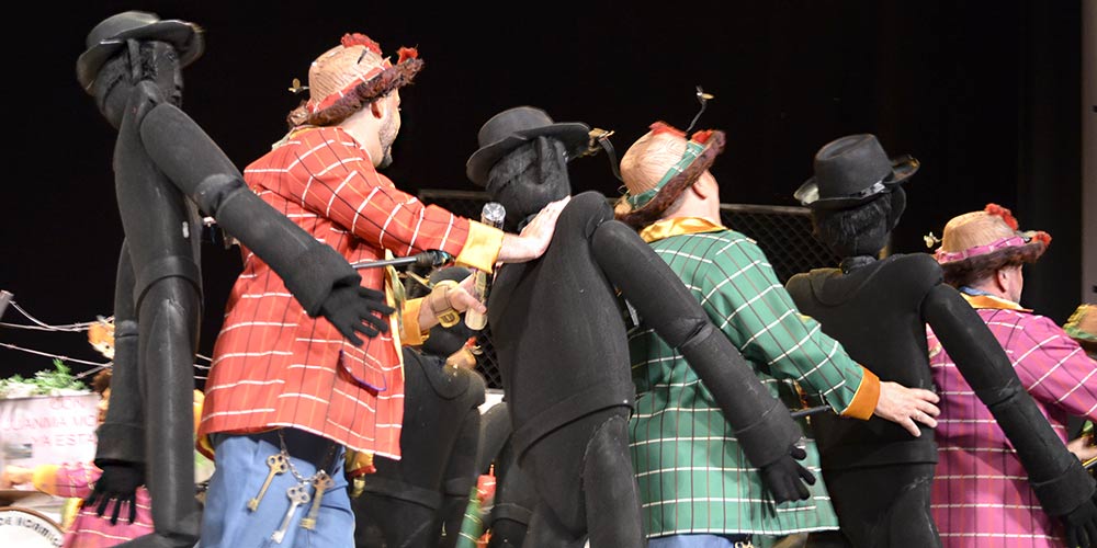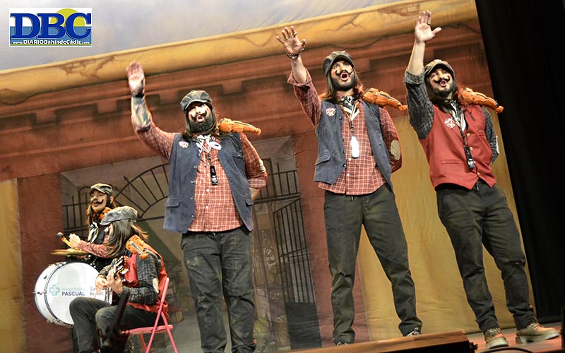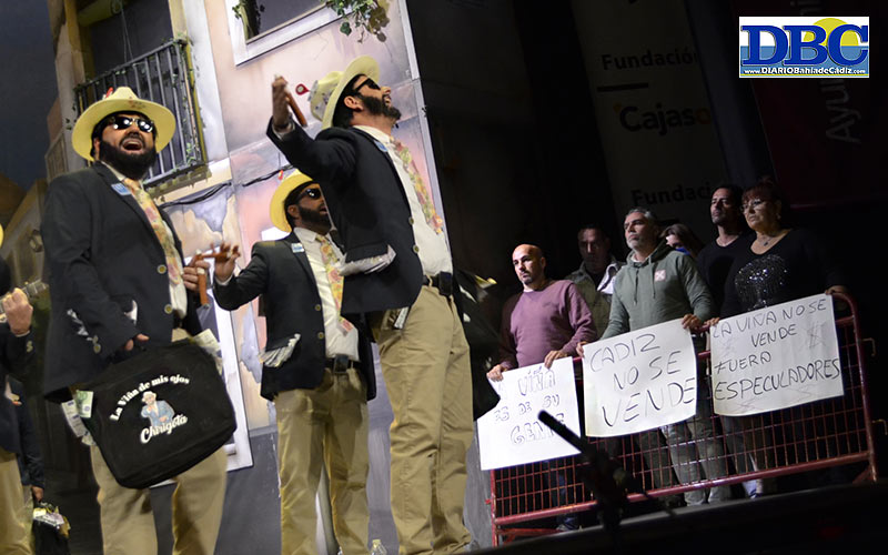 Y cerrando la bolsa de la función, con nudo marinero, especuladores a pelú, sacando el taco, comprando medio Cádi, expulsando a medio Cádi…, “compraventa de ocasión, donde me sobran, las raaataaaas”. Turno de la chirigota local con regusto a Santoña ‘La Viña de mis ojos’, con la autoría de Pablo Leiva Muñoz, Eloy Manuel Ortiz Cruz y Eder Rey Prada. Rondando el tipo, también en el primer pasodoble asustaviejas…, “a mí como empresario, que gestiona alojamientos, lo que más me desespera es que aparezca el Gago, y no vengan los de fuera”. El segundo hace chistes con el pleito del chorizo Juan Carlos I con el Revilla, para acabar con una sentencia: “nuestra monarquía lleva ya cincuenta años de okupa en la Zarzuela”. Ajá. A los cuplés, con ración revenía de AndyLucas, y del estonio eurovisivo del Espresso Macchiato bailoteando como la Rumana. Ajá. “Mi maletín es como la Viña, aquí también hay manteca”. No hay remontada en el popu, es un más de lo mismo, y “que me pague el alquiler, que me pague el alquiler”. Hasta la cuarteta chimpón donde, vaya, se quitan la careta usurera…, “no se vende mi acento, no se vende mi casa, no está en venta mi calle ni mi hogar, no están en venta mi patria ni mi ciudad”.
