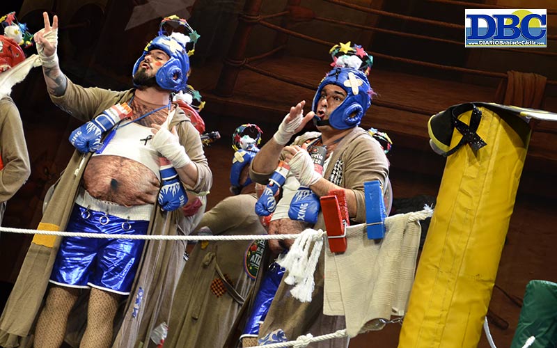“Escucha, Cassiusklein, no pegues tan fuerte que me pita la orejaaaa…”. Nos subimos al cuadrilátero. Juan esta KO desde el primer jipio. Saluda, o argo, ‘Tu cara me suena’, chirigota de La Línea con la autoría de Jesús David Victoria Rodríguez y José Antonio Viegas Ruiz. Boxeadores jartos de recibir, pero las guantá que duelen de verdad y hacen daño, a lo largo de los años, “son los golpes de la vida”, relata ese pasodoble primi, que acaba, abrupto, llamando a esquivar los ganchos “de la ultraderechaaaa”. “Es difícil ser fino y al mismo tiempo ser natural”, reflexiona la otra letrilla sobre las ambiciones reales de la propia chirigota. En la calle nos vemos, primo. Un cupletillo se piensa eso de practicar el poliamor…, “es que dos ná más no pueden pagar el piso”, jeje. Ha tenío su punch, ome. “Me enseñó mi mare, a base de babuchasos”. Último round: “¡qué viva, me extraña!”. Juan, tira la toalla portumareeee. Chirigota sin sangre, pese al tipo tipo.