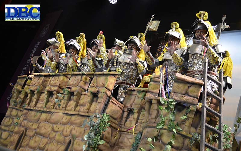 Con el Falla pitoso e intrigao, esperando otro ascensor, segunda parte. Se hace la luz, y la comparsa de Écija saluda trompetera y caballeresca desde lo alto de un torreón, de guardia, y sin asegurar. Defendiendo este castillo, cerraíto con pestiño, con una cordial presentación. ‘Nos hemos venío arriba’, con la autoría de los hermanos Castro, Juan Francisco y David. Y reminiscencias bizcocheras. De entrada, partiéndose la armadura por Cádi… “y te entrego el pasodoble pa jurarte pleitesía”. Para seguir arrodillao ante el pregonero…, “carnavalero y ateo por obra de dios”. Su amiga Aroa y su vecina Amparo, protagonistas de los cupleses: una barbacoa vegana… “y nos multó la guardia civil por quemar rastrojos”; y una declaración de la renta con dos “folladores”, jejejej. “Cuando llegan carnavales y cantáis nuestro estribillo, se nos ponen los pezones, como timbres de castillo”. El popu entipado y pamplinoso va encadenando cuartetas cortitas, buscando golpe y golpe tras golpe, alguno más celebrados que otros, y “que alguien vaya a buscar a la leprosa y le lleve sus cosas”. Y claro, ganan la batalla pero la pierden si bajo las murallas se asoma Cádi, en el remate. Tienen un nosequé que no te pueden caer mal, Juan. Lo que les falta de maldad lo compensan con haber caído de pie. Pero por si acaso, baja por la escalera.