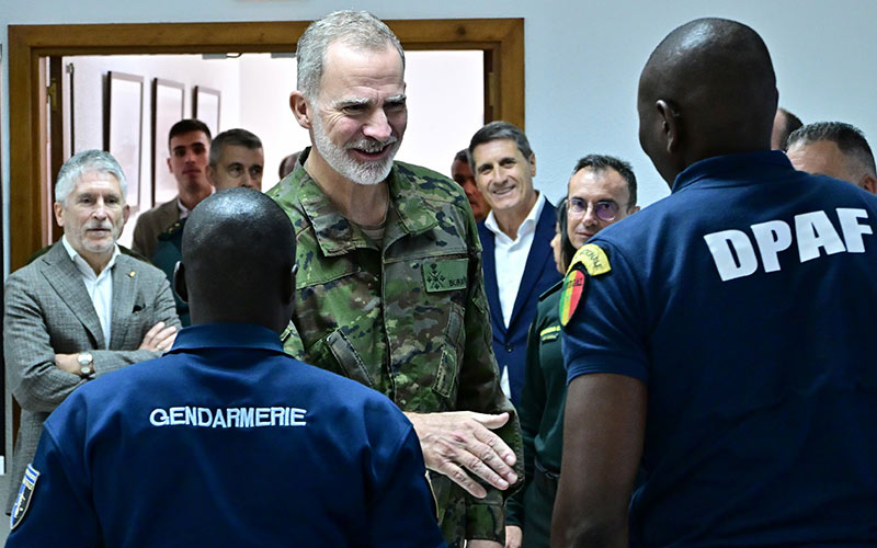 Como gesto de aliento a la labor de la Guardia Civil, el rey Felipe VI ha bajado este viernes por unas horas a la capital gaditana, enfundado en su uniforme del Ejército de Tierra, para supervisar junto al ministro del Interior, Fernando Grande-Marlaska, las instalaciones de la Unidad de Formación y Doctrina de su Servicio Marítimo (nacido a principio de los 90 del siglo pasado), ubicadas desde hace meses en una de las naves de la antigua Altadis, suelos incorporados al recinto fiscal de la Zona Franca de Cádiz.