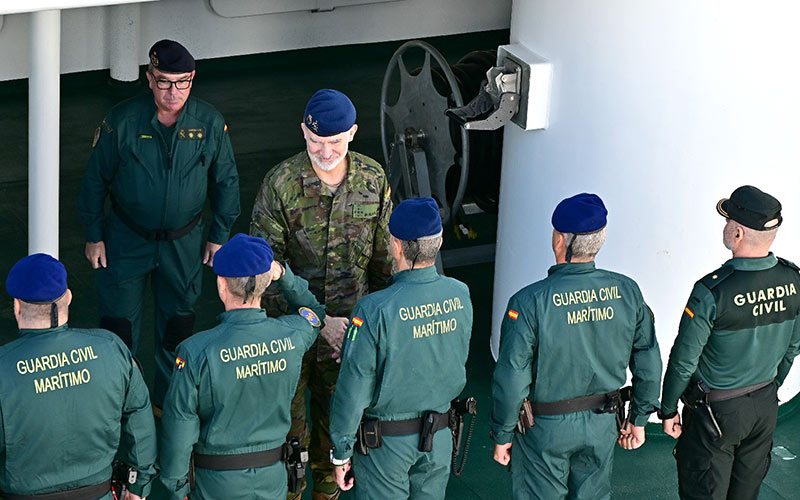 Antes de continuar, firmó en el Libro de Honor del centro y descubrió una placa conmemorativa. Y continuó la mañana acercándose al buque-aula en seco ‘Río Pisuerga’, antes de embarcar en el nuevo buque oceánico multipropósito de la Guardia Civil ‘Duque de Ahumada’, recorriéndolo desde la sala de náufragos y la cocina hasta los camarotes, el puente de mando y los sistemas de vigilancia.