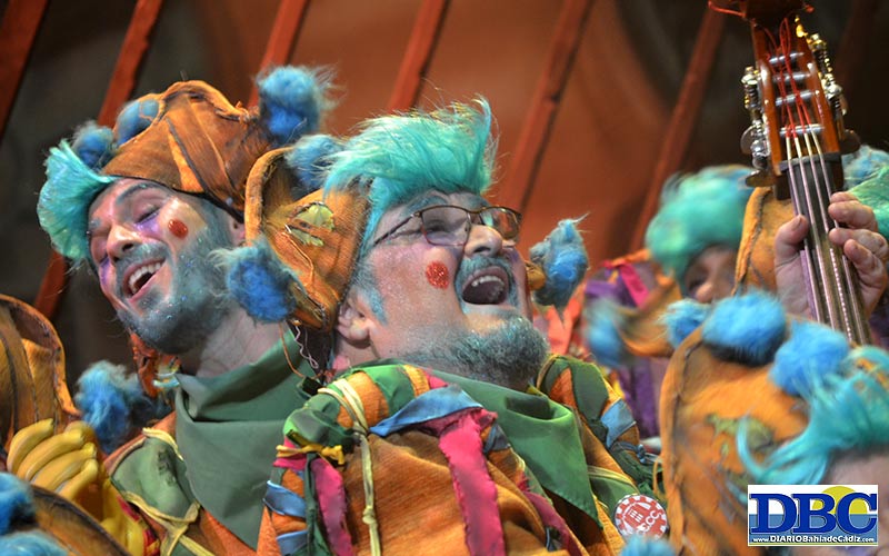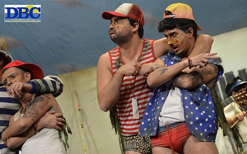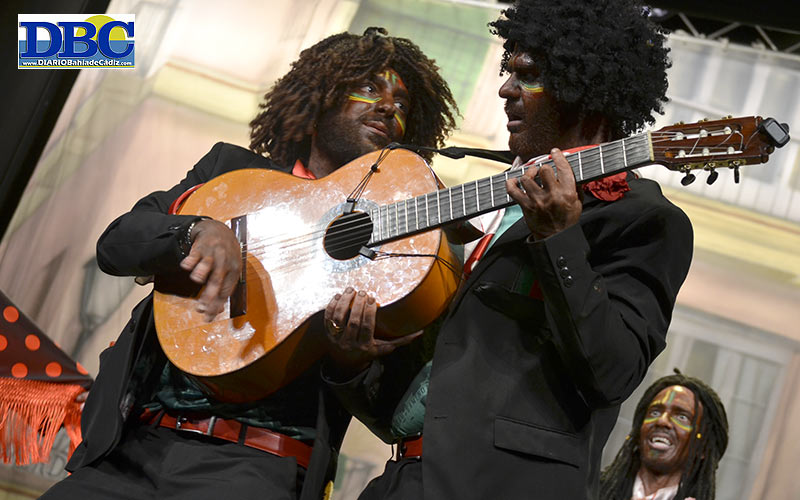 Y taponando la función, la fusión flamenquito-furbolera, porque sí, de la chirigota de Pedro Tamayo, Boita y Moisés Serrano, ‘Los Camerún de la Isla’…, “por el agua, yo vine por el agua, yo vine por el agua”. Un primer pasodoble excluyente con los burgaleses, ojanoso con las chirigotas que suenan y saben a Cádi Cádi…, “claro que soy localista, yo soy de Cádiz, no veo un concurso hecho pa los turistas”. Po ahí lleva razón, chulo. Una mijita de sobreexcitación sobre las tablas. ¡Oleeee! Amor perruno en la segunda letra…, “el que me escucha perdío en mi soledad… que me tiene el alma loca… que yo te juro que si mi perro hablara, sale en mi chirigota”. Guau guau. Negrito por fuera y blanquito por dentro, como los güevos kínder. Cupleses que suman puntos por el descaro, a la silla de los notas de la chirigota del Stephen Hawking, y al gafe de Javi Otero. Eto’o é, carnavá, Eto’o é, carnavá. El alboroto tapa las carencias de un pupurrí donde el Pedro, su ronquera y corgaera, llenan y mucho. “Cádi, a mí por la madrugá, a mí no se me ve ná… que caigan claveles, del gallinero… mi chirigota va rabiando libertaaAAAddd”. ¡¡Tigres, leones, de chico me pinchaban los balones…!! Juan, lo del guitarra por los suelos ha sido penalti y expulsión.