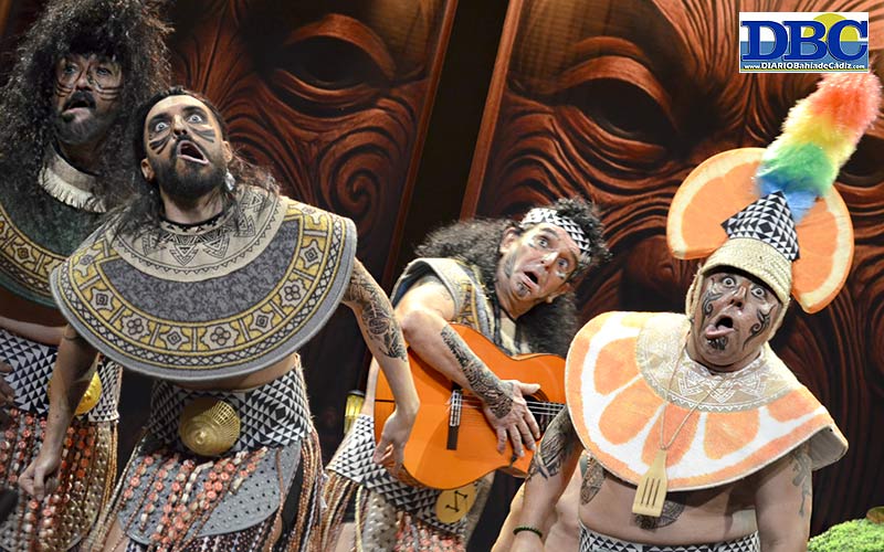 El e-cha-mán “habla peor que Joselito el del cuarteto”. Ya bailotea esta tribu maorí y sus mojigangas, “uuuhhh, aahhh, oooohhh, eeehhh… protestad, protestad, que pa esto está el carnaval”. Pisa las tablas la chirigota local ‘Los mohigangas’, con la autoría de Francisco José Fernández Día, Toté, y Ángel Piulestán. Un piropillo que a la vez busca movilización, de primer pasodoble, que “Cádiz es la de astillero, la del obrero, la que no huele a mar, me huele a metal…”, y si nadie mueve un dedo, “ese Cádiz tan bonito del que presumimos, de pena se muere”. Y el temita del bulliyng toma el otro pasodoble, que ya adulto reencuentra a un compañero del cole…, “te di de lado, te di la espalda, tú recibiendo un acoso tras otro sin que yo hiciera nada… dime cómo superarlo si sólo se tienen amigos cobardes”. ¡Aaaahhh, cómo quema el adobo del freidor! Un cuplé borbónico, sin más; y otro conociendo al nuevo obispo…, “parece un niño, no acaban de verlo, aunque el obispo de antes está loquito por conocerlo”, jejeje. “La danza de la lengua te la tienes que aprender… que si te gusta, máaaas le va a tu mujer”. El popu es lo que es, pero la cuarteta del maremoto no te ha disgustao, Juan…, “si viene a Cádi un tsunami, que venga después de las cinco, que ya hemos hecho la digestión… algo bueno tendrá, ese día en cinco minutos, baldeamos to la ciudad”. “Hazle burla a las penas que el karma te lo agradecerá”. Apuntado queda. ¿Y esa cara?