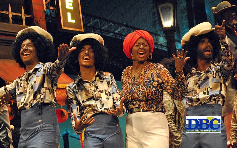 Activando la cuenta atrás… tres… Nuevo paseo por ‘El barrio negro’, el coro afro de los Estudiantes… ¡a bailotear! con estos malabaristas en el arte de vivir. Echa betún. A los vecinos quejicas ese primer tango, sin señalar a los de Muñoz Arenillas…, “ay Cádiz, que te mata la pena, qué hacemos con todo ese ruido que te viene a molestar… dime qué podemos hacer sin armar jaleo, somos carne de turista por más que no queramos verlo… si la mano que te da de comer es la misma mano que por la noche te quita el sueño… yo te quiero viva, te quiero vivaaaa”. Original ese tango que no se cree que el modelo productivo de la ciudad pueda dar un vuelco a estas alturas. Y con coraje se canta el otro, con conocimiento de causa: son un coro mixto…, “qué fácil es llenarse la boca con coplas de palabras vacías, levantar un teatro desde la hipocresía, pidiendo igualdad y respeto en el carnaval… de qué sirve pedir igualdad si luego no es cierto… mientras tengamos que lamentar comentarios fuera de lugar, y no tengan total libertad de subir contigo a cantar, me están sobrando las letras… feminismo barato para esconder el papel que le estáis dando a la mujer en nuestro concurso, nuestro concurso”. Bastinaso gordo. La suegra debe saber nadar, en uno de los cupletillos; el onanismo no lo desactiva ni el pin ni el puk, en el segundo. Lo que pasa en el barrio, se queda en el barrio, pa ti pa mí, pa ti pa mí. “Por el derecho a ser igual pero distinto” ese popurrinaso ¡equality now!, con sueños ni blancos ni negros, e imposible de fotografiar sin que te salga algo movido. Pedro, Pablo, dejad de babear, que os gusta mucho un espectáculo que además diga cositas…