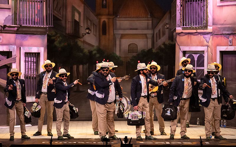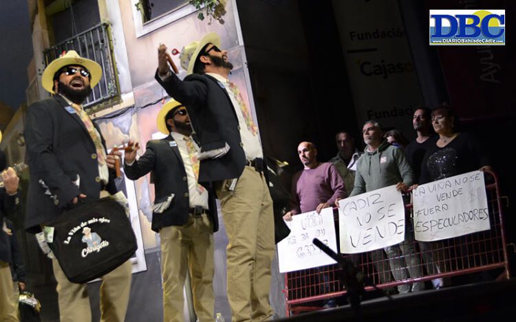 Y cerrando la bolsa de la función, con nudo marinero, especuladores a pelú, sacando el taco, comprando medio Cádi, expulsando a medio Cádi…, “compraventa de ocasión, donde me sobran, las raaataaaas”. Turno de la chirigota local con regusto a Santoña ‘La Viña de mis ojos’, con la autoría de Pablo Leiva Muñoz, Eloy Manuel Ortiz Cruz y Eder Rey Prada. Rondando el tipo, también en el primer pasodoble asustaviejas…, “a mí como empresario, que gestiona alojamientos, lo que más me desespera es que aparezca el Gago, y no vengan los de fuera”. El segundo hace chistes con el pleito del chorizo Juan Carlos I con el Revilla, para acabar con una sentencia: “nuestra monarquía lleva ya cincuenta años de okupa en la Zarzuela”. Ajá. A los cuplés, con ración revenía de AndyLucas, y del estonio eurovisivo del Espresso Macchiato bailoteando como la Rumana. Ajá. “Mi maletín es como la Viña, aquí también hay manteca”. No hay remontada en el popu, es un más de lo mismo, y “que me pague el alquiler, que me pague el alquiler”. Hasta la cuarteta chimpón donde, vaya, se quitan la careta usurera…, “no se vende mi acento, no se vende mi casa, no está en venta mi calle ni mi hogar, no están en venta mi patria ni mi ciudad”. DIARIO Bahía de Cádiz