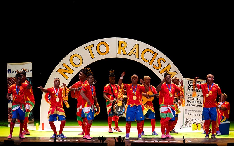 “Abascal ve mi cuenta del banco y dice, tú eres blancooo”. Lamines Yamal y Nicos Williams, en lo arto de las tablas, tiznaos: ¿eso no es racismo? ‘Los legales, nosotros si no??’, chirigota sevillana sacando los colores a la fachosfera y xenófobos varios, o al menos es la intención, con letra de Carlos Acal y música de Adrián López. “Y luego la culpa de todo es de cuatro que rezan en una mezquita”, canturrea el primer pasodoble surtidito, que termina lamentando el desmantelamiento de la sanidad pública gracias al Juarmamoreno. El segundo se queja de los políticos, cuela la tragedia de Adamuz, y acaba como acaba…, “solo el pueblo salva al pueblo”. Afú. Está de rebajas la frasesita. La tanda de cuplés, un refrito de chispazos cortos a pelú…, “qué mala suerte tiene todos los Lucas”. “El día de nochebuena yo le comí to el culo a mi suegro, me dijo veeeen, dame un beso, negro, dame un beso negro”, de estribillo, profundo y oscuro. El popurrí nace caralsol. Y el Abascal sigue brotando cada dos versos, “y no nos puedes deportaaar”. Con cameos prescindibles de Casillas y el padre del Yamal. “No soy un mono, aunque tú en el campo hagas asín, jujujuju… que ser de fuera, no es impedimento para decirte lo que por ti yo siento… que hay que matarme pa quitarme de tu lao… gooooool”. Anulado, Juan, anulado. DIARIO Bahía de Cádiz