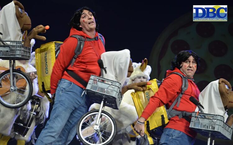 De momento, London toma el Falla. Se pasan con el humito, prima…, “volando voy, volando vengo”. ¿Gaviotas? ¿Repartidores a domicilio?… no son de Glovo, son de Glovete, que rima con ÉT, y ahí se desvela el misterio, Eliot con su extraterrestre en la bici…, “para hacerme a mí un pedido, dos cosas necesito, tu casa, teléfono… se lo llevo calentito”. Con esta niebla no ha sido fácil enterarse del holaquéhay de ‘Los que se lo llevan calentito’, una chirigota jerezana, firmada por Manuel Alejandro García Rey, Álvaro Astorga Cardoso y Manuel Jesús Vergara Román. “Cuando reparto fuera, no me canso llevarte por bandera”, remacha el primer pasodoble tesquieroCádi de “un hermano de Jerez de la Frontera”. Juan, si dura mucho esto, acabamos intoxicados. Fuuuu, segundo pasodoble cuñado, que todos los políticos son iguales, aro aro…, “vamos a bajar ya de la nube, yo votaba a to esos mierdas con b, no con v, sólo se ponen de acuerdo pa subirse el sueldo, mientras EspÁña se hunde”. Más ¡¡humo humo!!, para los cuplés. ¡Deja de fumá! Esto es inviable… irrespirable, Eliot, Eliot, Elihoputa… “Po yo creo que soy marciano”. La escatología no se escapa de un desatino de pupurrí absurdo, con cameo de una celebrada Plutoche…, “los muertos de la maleta, me pica el culo y no llega el deo… yo no pago el cubierto, ooo ooo, porque como con las manos… tú me llamas, que yo voy volando…”. Y todo este dislate tenía un trasfondo serio, ehhh: lloriquear que “los de traje y chaqueta, calentito se lo están llevando”. Y el teatro explota: ¡¡que salga la marciana, que salga la marciana!! No sale, Juan. Oooohh. DIARIO Bahía de Cádiz