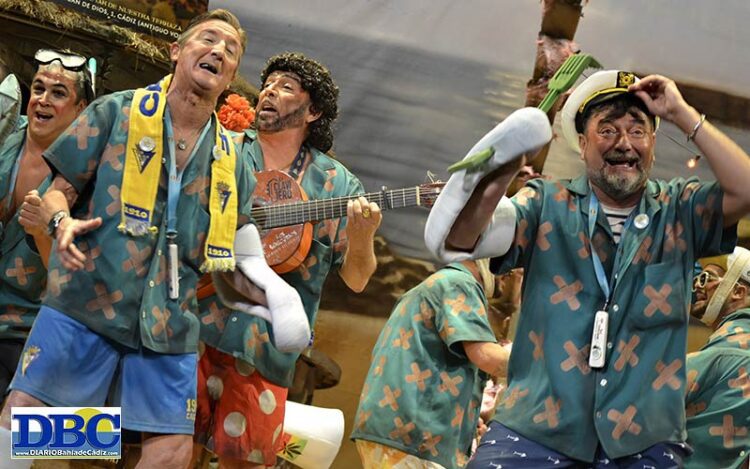 Sube, sube la temperatura con el Sheriff en escena. ¡A ver si termina el árbol genealógico! Jajaja. Puntazo  ahí, entre lo oscuro del patiobutaca. “Lo mal que estoy, y lo poco que me quejo… yo no soy flojo, es que la tengo de cemento… pero no echarme fotos, que estoy de baja”. Saluda la chirigota ‘Los semicuraos’, con letra y música de Juan Manuel Braza Benítez. Medio-escayolaos, en el chiringuito. Defensa del estilo propio, sin bajarse los pantalones a los gustos del jurao de turno, en ese pasodoble llorón con shentimiento de Loreto: “mis dolores se curan cantando… me duele los que por ti mueren y luego se olvidan… yo loco por mi Tacita, y tú estás loco, loquito de envidia”. “Con los sueldos que han ganao, cuántas juergas y putas habrán pagao…”, se pregunta la segunda letrilla facilona, observando a todos los políticos como inútiles mangantes, a los que no persigue la mutua. Todos son iguales, Juan. Aro. Tanda de cuplés, de dos en dos. Tiritos a los comparsistas para acabar rescatando al Carli y al Subiela; y otros fantasmagóricos. O argo. “Si en estos carnavales, tú a mí no me ves, búscame, búscame, porque yo no me encuentro bien”. El popu, frenético, fiestero y perseguido por el detective de la mutua (palabro que se repite insistentemente), es lo que es, sin más, hasta un remate potable: “ni de baja ni de bajón, no quiero verte Tacita… que en la vida siempre hay altas y bajas, lo importante es no perder la ilusión… sal del agujero y toca el cielo”. Toca, pero no sobes, Juan. DIARIO Bahía de Cádiz