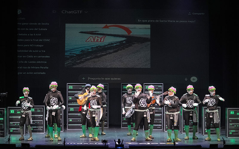 “Por lo menos nohotros semos doce”. Saluda una chirigota muy joven, de Cádi, en modo ChatGTP, nooo, ChatGTF…, “lo único que no he escrito es la chirigota de Tenerife… pregunta pregunta pregunta, pregúntame lo que tú quieras”. ‘¡¡Qué más quiere que te diga!!’ se llama este engendro fresquito con los servidores echando humo, en modo dark, con letra y música de Pablo Carril, Rubén Muñoz y Hugo Virlán. El forillo virtual va acompañando el repertorio, jeje. Un primer pasodoble reivindica a los profes de la pública para gobernar el país. “No sé que esperas tierra mía, para acabar con esta sangría… el exterminio de nuestra alegría… gaditano lucha porque esto ya se acabe, y recupera de una vez tus carnavales”, apela la segunda letra anti-macrobotellón foráneo. Con convicción. Procesando, procesando… generando bola de pelo: un cuplé, narcoléptico, y otro ludópata, aunque en realidad son meras escusas para soltar veneno, jejeje. “Eso tiene que ser IA”. Popurrit con USB, entretenido y guasón, y hechuras a madurar. “El Peluca se cree Manuel de Falla… Llama a Fran Quintana”, jajajaja. ¿Ya se acaba el pase? Vámonos por Cádi, mis niños…, “Cádiz, que más quieres qué te diga, si me dejas sin palabras… Cádiz, tú eres mi respuesta”. Bien rematao. Juan, con el ChatGTF hay que morir. DIARIO Bahía de Cádiz