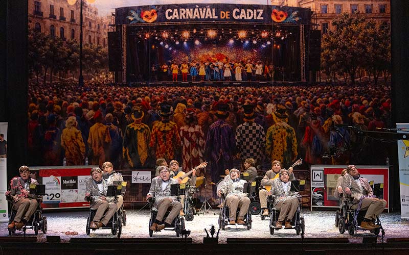 Stephen Hawking en formato chirigota. El Falla, ojiplático. “Si tienes ganas de llorar, piensa en mí… ha llegado el máquina, ha llegado el máquina… este año me va a ir todo sobre ruedas”. Presentación precedida de pasacalles a mala leche, que este físico teórico conocido por sus trabajos sobre agujeros negros y cosmología, también quiere disfrutar de Cádi y su carnavá. ‘Una chirigota en teoría’ se llama este potaje, removido por Miguel Ángel Llull. “Vamos a cantar bonito, que parecemos un surtidor de gasolina”, jejeje. Pasodobles con su parte jiji jaja con voz robótica, y su remate seriote y sin el tono artificial. “Y con mi silla de ruedas, yo he llegado a lo más alto, hasta las mismas estrellas”. Letra rendida al personaje real, cuya genialidad no la frenó el padecer ELA. La segunda, orgullosa de la banda (de cornetas y tambores) del Rosario, traspasando fronteras…, “ladra y eso es lo que hay, que cuando suena Rosario, quien está sonando es Cádiz”. Terminan el final del pasodoble rodando hasta el foso, como debe ser, jajaja, “me tiro al suelo… no puedo”, jajajaja. Cuplé lamentando la separtación de AndyLucas, no no, del Calos Meni y el Morera. Bueeno. Y el otro fresquito fresquito, con alusiones al peligro de trabajar para el Hulio Iglesias. Bueeeeenoooo. “Que este año evidentemente, no vamos a caer de pie”. Liándola sobre el escenario entre coplas con sus particulares tipo tipo. Y gritos de ¡¡chirigota, chirigota!! en mitad del absurdo pupurrí. Metidos en el papel, y ahí está una de las claves: el efectismo surrealista de verte al Hawking en las tablas soltando chorradas, y “paseando por la Palma voy así, con los muertos del que inventó el adoquín…”. Hasta el remate con shentimiento, y el patiobutaca de pie: “armémonos de valor, hasta los dientes, que Cádiz te guíe en la lucha, que vivir es cosa de valientes”. En global, maldad-gamberra que no llega a ser hiriente. Veinte minutos para que salten indignados quienes tienen tullido el sentido del humor. DIARIO Bahía de Cádiz