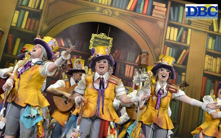Más metacarnaval, ahora entre estanterías de libros. El nombre no engaña. Bibliotecarias que atesoran “el legado de nuestros copleros… y si te sigues preguntando quién demonios soy yo, soy la madre que te parió… en la biblioteca del carnavaaaaaal”. Abre sus tochos ‘La biblioteca’, comparsa de los hermanos Santander Grosso, Manolín y Palmira, junto a la letra del cuñao y pareja, Manolo Cornejo, el invisible del párrafo anterior. Shiiiiiiii. Interesante y original ese primer pasodoble empiropao…, “siempre que suena un piropo a Cádiz en nuestras coplas, la llaman mujer y madre, amante y novia… siempre usamos el femenino… creo que está bastante lejos de que sea una mujer… no permitiría cómo sus hijos se marchan a otro lao, nunca votaría al descendiente de quien tanto le ha quitado… por muchas vidas que pasen, para ser mujer y madre, aún te faltan dos ovarios”. Y pullita al párroco de Santa Cruz, para avanzar…, “que me perdonen las manos que ayudan a los más pobres… si vas a hablar de lo que es o no es cristiano, quédate callado… confiésate primero, y veremos el jueves santo quién es más digna portando al que murió en el madero”. Ahí no se mete Juan. Pasa página. A los cuplés: ¿Cádi Árabe con olor a grifa? Y ¿Halloween con Hulio Iglesias metiendo sustos? “Ay tiquitiquitiquitiquitán, Cádiz de buscar ya me estoy jartando… que no viene en los libros, por qué te quiero tanto”. El popu se deja escuchar, pero no aporta nada novedoso más allá del submundo carnavalero, salvo esa quema de libros odiosos…, “y si algún día se te olvida la esencia, volveré a abrirte la biblioteca”. De ocho a dos y de cinco a nueve. DIARIO Bahía de Cádiz