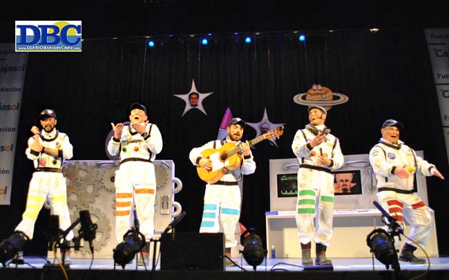 A la luna, lunera, con Maríalahierbabuena y Manolocornejo, entre las estrellas del firmamento del forillo. El comandante Medina reclutando, “no vea la que me queda”, en la parodia del cuarteto capitalino ‘Mission impossible Los astromantas’, con Manuel Zambrano, Antonio Rivas y Luis Miguel García-Verdugo como autores. Ahí entran en la MAZA el astromanta Mi arma, el astromanta Donete y el astromanta Impaciente, digo digo digo, y como su nombre indica, empieza despidiéndose. Organizando la missión de M.Rajoy a la luna, en cinco años, y cada personaje reiterándose en sus coletillas y estereotipos, digo digo digo… Se suman dos aspirantes más para interpretar los cuplés, simpáticos, sobre todo el primero. Sin gravedad, no veash cómo se les puso el asunto… “me desperté, me miré la picha y me dio un coraje”, jeje. No tenemos un problema, Houston, tenemos un problemaso. El tema libre es un seudopopurrí sin pies ni cabeza… “que yo sólo quiero estar a tu vera, porque para mí, tú serás mi estrella”, con explosión de papelillos en el remate, los que le sobraron al coro del Juliopardo del año pasao. Voluntariosos. El tontito de las banderitas mira a Saturno. El señor mongolo (de Mongolia) busca la Osa Mayor. Con canas ya.