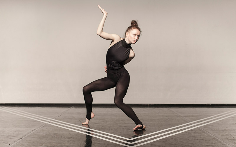 De principio, en el negro suelo se acota el espacio de la bailarina con un trazado triangular, alusivo a la formación típica de las aves en vuelo. Es un triángulo de seguridad, pero también limitador, porque, como en un vuelo, resulta imposible de modificar o transformar. La sombra de la bailarina se proyecta sobre la punta de ese triángulo, manejando el suelo como espacio virtual de trabajo.