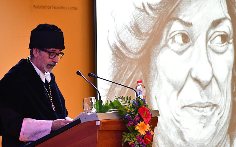 Posteriormente, Juan José Téllez ha realizado el discurso de agradecimiento en representación de la nueva doctora. En un difícil ejercicio de portavocía y desde un sincero homenaje a su persona, el algecireño ha interpretado cuáles serían sus palabras en una ponencia, recogiendo y parafraseando diferentes textos (de discursos, declaraciones y artículos publicados en El País) e imaginando sus reflexiones con el amparo de su estrecha y confidente amistad: “desde muy pronto, recuerdo que quise ser escritora. Mi abuelo me regaló para mi primera comunión una versión de ‘La Odisea’ que me gustó mucho. Luego, leí ‘Mujercitas’, de Louisa May Alcott, y entonces quise ser Jo March. Estudié Prehistoria pero creo que un novelista y un historiador son como dos coches que se cruzan en direcciones contrarias en la misma carretera. Un historiador debe documentar la historia que tuvo que ser verdad y un novelista inventa una historia que tiene que parecer real. Ahora me siento más cerca que nunca de mi carrera”.