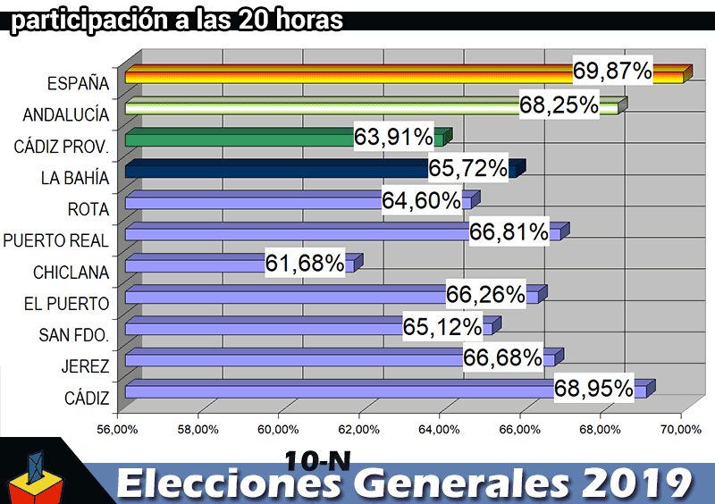 En cuanto a la Bahía de Cádiz, se registran bajadas generalizadas de la participación: la capital vuelve a ser las localidades menos abstencionistas, y en el lado contrario, Chiclana es la más pasota. En el conjunto, al cierre de urnas, ha ejercido su derecho al voto el 65,72% del total (un 5,59% inferior a las últimas generales; que a su vez supone medio punto menos más que en los comicios estatales de 2016).