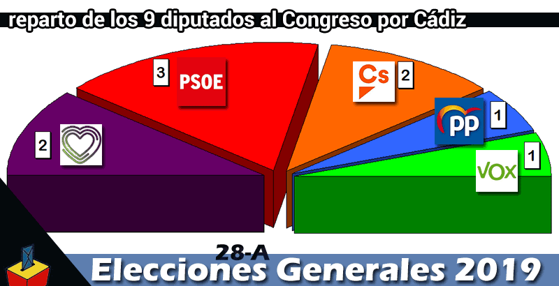 En Cádiz se reparten nueve escaños a la Cámara Baja. El PSOE ha ganado ampliamente estas elecciones, con un 69,3% de participación en la provincia, sumando 3 diputados, los mismos que ya tenía en la pasada legislatura (y el 31,5% de votos).