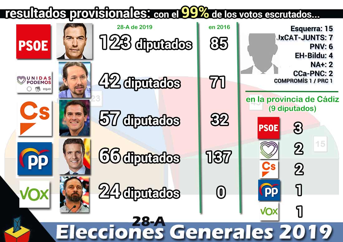 La encuesta previa al recuento de papeletas, difundida por RTVE al cierre de colegios, no estuvo muy descaminada. Y con datos reales del Ministerio del Interior, al 99% del escrutinio (y con el 75,75% de participación, nueve puntos más que en 2016), el PSOE se impone en estas elecciones generales de 2019 pero, como se esperaba, lejos de esa mayoría absoluta de 176 diputados: obtiene más de 7,4 millones de electores, el 28,6% de los votos y 123 escaños (tenía 85), ganando 38.