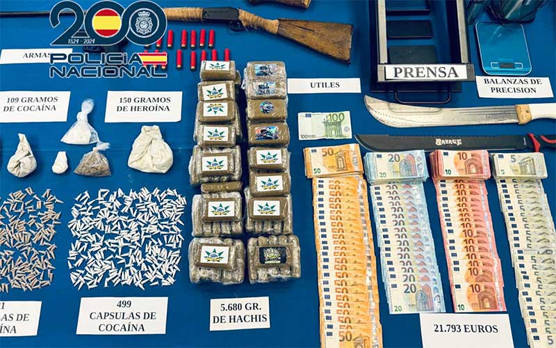 Durante los registros los agentes intervinieron un importante material relacionado con esta actividad que incluye: 499 dosis de cocaína, 681 dosis de heroína, 5,6 kilogramos de hachís, 5 kilogramos de marihuana, 150 gramos de heroína, 109 gramos de cocaína, cultivo indoor de marihuana con 64 plantas, diverso material eléctrico, 14 gramos de sustancia adulterante, 120 comprimidos de diversos opiáceos, una pistola simulada, numerosas armas blancas de gran tamaño, dos escopetas de aire comprimido, diferentes útiles para la manipulación de la droga y anotaciones relacionadas con la actividad delictiva.