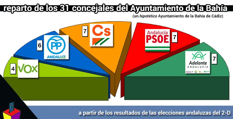 Partiendo del censo electoral de las elecciones autonómicas del pasado 2 de diciembre, en la Bahía gaditana hay más de 541.000 electores, una cifra cercana a los 587.000 que aparecen en el censo de la ciudad de Sevilla. Precisamente, el Ayuntamiento de la capital andaluza sirve de referencia para nuestro ‘juego’: con dicha población está conformado, por ley, por 31 concejales, los mismos por lo tanto que ese hipotético Consistorio de la Bahía.