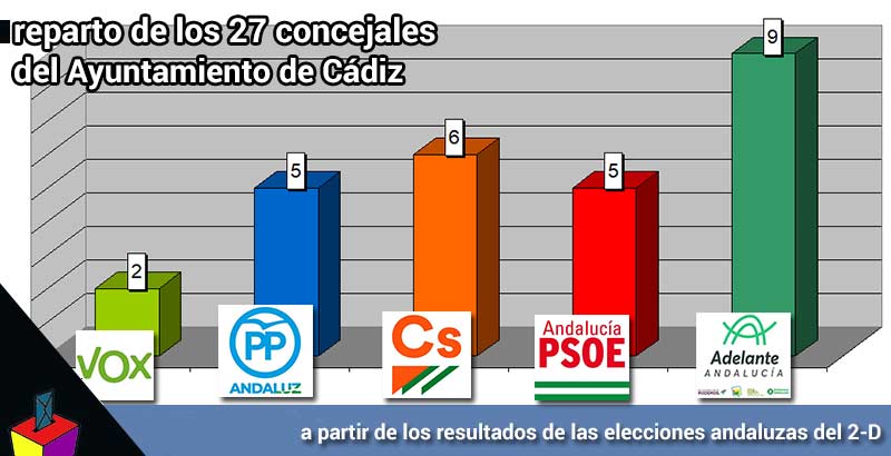 Así, estaría más cerca la repetición de un gobierno de izquierdas en la capital gaditana que uno de derechas; dependería de nuevo de que los socialistas apoyaran (bien solo en la investidura o entrando en el equipo de Gobierno) a la coalición de Podemos e IU (suman exactamente 14 ediles, la mayoría). Por el otro lado, Cs, PP y Vox, si se unieran, llegarían sólo a 13 ‘sillones’.