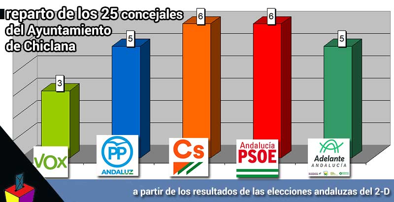 En estas hipotéticas elecciones (con más de un 50% de abstención) se impondría Ciudadanos con 6 ediles y el 23,32% de las papeletas, un partido que hoy día no tiene ni representación en el Consistorio chiclanero. Por detrás se situaría el PSOE, con 6 representantes (tiene 11 hoy día) y el 22,92%. El PP perdería 3 concejales, quedándose con 5 (el 17,95% del total); Adelante Andalucía alcanzaría también 5 ediles con el 17,16% (actualmente IU tiene 3, Sí se puede 2, y Ganemos 1); y Vox se situaría como quinta fuerza estrenándose con hasta 3 concejales (el 12,23%).