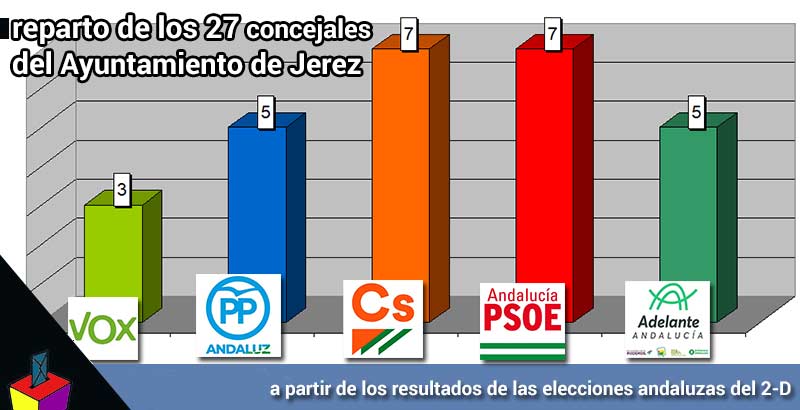 Cs y PSOE empatarían a 7 concejales en el Ayuntamiento de Jerez: los naranjas sumarían el 23,51% de los votos y 5 ediles más que en 2015, y los socialistas el 22,43%, y el mismo número de representantes que hoy día. El PP se quedaría con 5 concejales (6 menos) y el 18,04%; Adelante Andalucía con 5 y el 17,45% (Ganemos Jerez tiene hoy 5, pero no es exactamente Podemos, aunque en su momento participara de la agrupación de electores, e IU cuenta con 2); y Vox pasaría de 0 a 3 ediles (y el 11,88% de papeletas).
