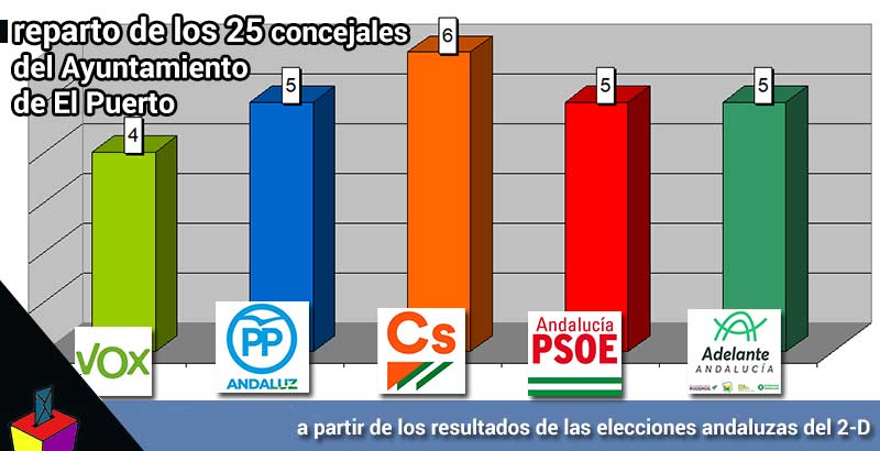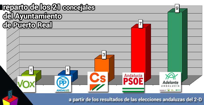 Adelante obtendría 9 ediles (actualmente, Sí se puede tiene 7, Equo 3 e IU 1) y el 34,60% de los votos, mientras el PSOE subiría a 7 (y el 26,46%), ganando 4 representantes con respecto a lo cosechado en 2015. Ciudadanos, que actualmente no tiene ediles en Puerto Real, llegaría a 3 (el 15,05%); el PP volvería a tener presencia con 1 concejal (el 7,54%); y Vox también tendría 1, con el 5,60% de las papeletas. Cabe anotar además que AxSí estaría más o menos cerca de obtener representación (rozó el 4% de los votos el pasado 2-D), algo que parece razonable, teniendo en cuenta que en 2015 el Partido Andalucista llegó a los 7 concejales, y que en el mandato precedente gobernó con mayoría absoluta. En este punto cabría preguntarse qué eligió el votante andalucista en las elecciones autonómicas.