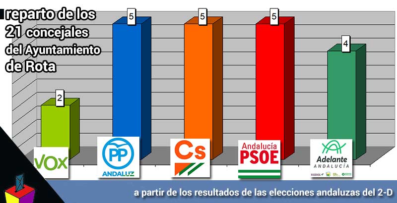 Ciudadanos llegaría a los 5 ediles desde la nada con el 23,40% de las papeletas. PP y PSOE también lograrían los 5 representantes cada uno (con el 20,94% y el 20,11% del total, respectivamente): los conservadores ganarían 1 y los socialistas perderían 5, con respecto a 2015. Además, la coalición de Podemos e Izquierda Unida obtiene 4 concejales y el 19,01% de los sufragios (hoy, IU tiene 2 y Sí se puede 1); y Vox lograría el 10,68% y 2 representantes. En 2015, Roteños Unidos llegó a los 4 concejales, por lo que estos resultados extrapolados quedan algo cojos: habría que contar también con esta fuerza independiente (que no concurre a las autonómicas). Dany Rodway