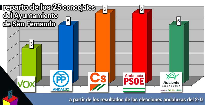 Parecido panorama se daría en el Ayuntamiento de San Fernando, donde desde 2015 cogobiernan en minoría PSOE y el desaparecido PA, apoyándose en muchas ocasiones en Cs. Los de naranja ganarían con el 22,55% de los votos y 6 concejales (tienen 3), mientras los socialistas llegarían también a los 6 (2 menos) con el 21,77% de los sufragios. Adelante Andalucía obtendría 5 ediles y el 17,57% de papeletas (en 2015, Sí se puede consiguió 4); el PP bajaría 2 más, quedándose con 5 concejales (y el 16,92%); y parte de sus electores, se evidencia, se fugarían a Vox, que de la nada pasaría a 3 representantes (el 13,26% del total de votos).