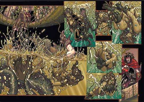 ‘El corazón ardiente’ (dividida en Otro día en Gerada, Elemento Sorpresa y la Ira del Dios del Fuego) ocupa la mayor parte del tomo, es la primera aventura escrita para esta pareja de barbaros, fue publicada originalmente en 2001 por Sulaco Ediciones bajo el título ‘El corazón de un dios’, nos presenta a un Juan José Ryp en sus primeros trabajos, donde ya apuntaba unas maneras del maestro que es, y esa pasión por llenar cada viñeta, por crear una atmosfera asfixiante que le viene a la perfección a la obra. Tras robarle una poderosa joya a un noble, Bram y am y Weasel se ven perseguidos por varios frentes que desean recuperar el corazón del dios del fuego Reshef. Magia, traiciones, todos los frentes del poder de Gerada, corrupción. Una historia entretenidísima, donde cada personaje pasa de enemigo a aliado y al contrario en el latido de una viñeta.