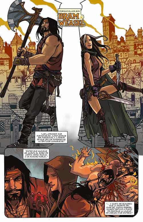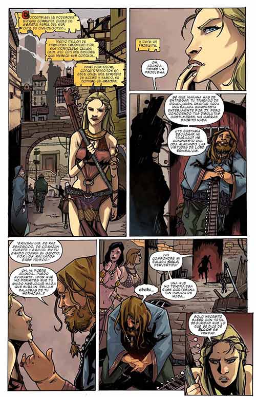 La primera aventura es ‘La canción de los Bribones’ una historia corta, donde una hermosa barda intenta inspirarse para componer una oda a “los ladrones más formidables, aventureros sin parangón…”. El dibujo corre al cargo Rubén Rojas el cual nos hará un pequeño recorrido por las calles de Gerada, que hará las delicias a los amantes del género.