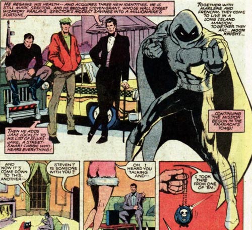 A través de estás apariciones fuimos conociendo que su nombre real es Marc Spector, que era rico, que llevaba una doble vida de héroe y filántropo, y que tenía vehículos y equipo basados en su símbolo, la Luna (Luna-cóptero, shurikens en forma de media luna, etc). Conocimos a su novia Marlene Alreaune, mujer de armas tomar que ayudaba a Spector en sus aventuras; conocimos a su amigo, y piloto del Luna-cóptero, Frenchie, y a otros secundarios y enemigos, aunque sabíamos muy poco de su pasado.