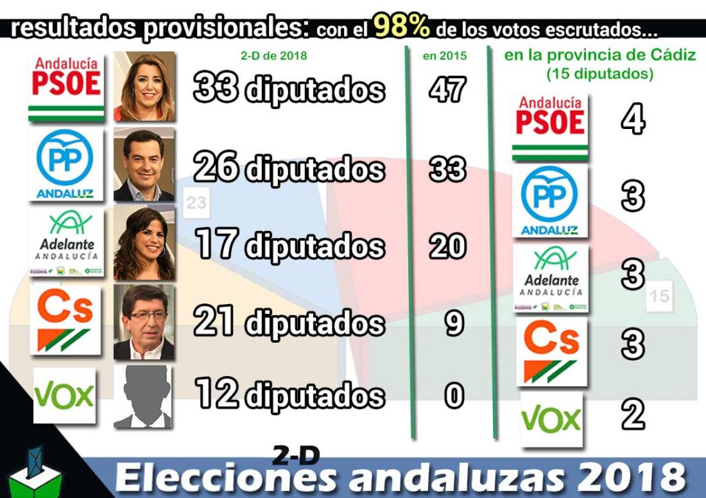 Al 98% del escrutinio de este 2-D, el PSOE suma 4 representantes (en 2015 alcanzó los 6); Ciudadanos pasa a ser segunda fuerza, con 3 diputados (tenía 1); Adelante Andalucía obtiene 3 (tenía 4 hace tres años); el PP pasa al cuarto puesto, con 3 sillones (tenía 4); y Vox suma hasta 2 (tenía 0).