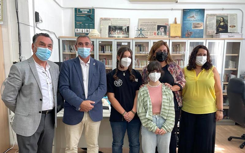El delegado territorial de Educación y Deporte de la Junta de Andalucía, Miguel Andréu, acompañado de la alcaldesa, Elena Amaya, ha querido felicitar personalmente al equipo docente y alumnado del instituto puertorrealeño por el galardón otorgado en la categoría de ‘buenas prácticas docentes para el fomento de la lectura’, a los centros de Secundaria. Supone un trofeo y 5.000 euros (a destinarse a reforzar la realización de actuaciones de mejora de la biblioteca y de fomento de la lectura).
