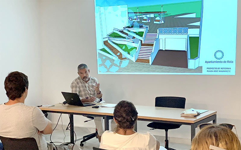 Vecinos de la plaza José Navarrete, en Rota, se han reunido con el alcalde Javier Ruiz Arana para conocer de primera mano detalles de las obras de mejora que se van a llevar a cabo en esta plaza pública de la ciudad; una actuación que principalmente busca solucionar los problemas de filtraciones que afectan al aparcamiento subterráneo privado.