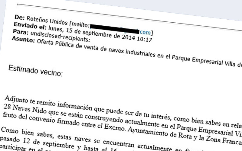 El PSOE afirmaba que el correo electrónico objeto de denuncia, al que dice haber tenido acceso ante la queja que le han trasladado algunos vecinos indicando que “nunca habían facilitado su dirección de email a dicho partido independiente, sino al Ayuntamiento”, indica en su asunto que se refiere a la “oferta pública de venta de naves industriales en el Parque Empresarial Villa de Rota”, habiendo sido enviado desde una dirección de RRUU y estando igualmente firmado por dicho partido.