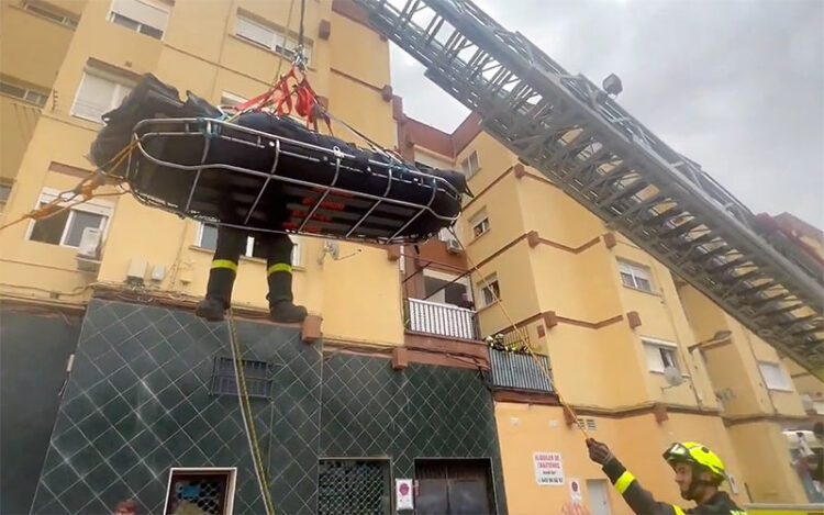 “La estructura para poder trasladarlo desde su cama a la ventana y a otra habitación y de ella a la terraza es todo un tributo a la creatividad y la seguridad”, apostillan los Bomberos. Y a continuación “la subida del exterior colgada de un sistema de poleas con la escala, venida desde Madrid, las lonas/colchón deslizante desde Málaga, y la ambulancia, de Algeciras”.