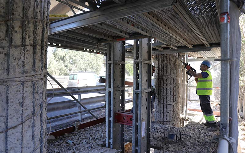 Estos trabajos, que cuentan con una inversión municipal de 150.000 euros y un plazo de cuatro meses, se llevan a cabo en la estructura central, de las tres existentes que conforman los accesos al centro comercial. Se centra en el arreglo de las pilas y la ejecución de nuevas juntas de calzada impermeables.